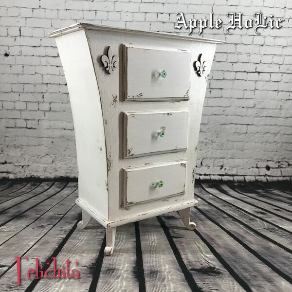 エイジドペイントした真っ白なボディーはシャビーシックな雰囲気が○。